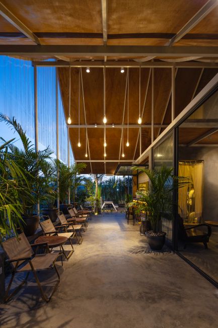 La struttura spaziale che ne consegue è unica: rendendo morbida la materia del ferro si ottiene l’effetto di un tessuto che sembra dissolversi nello spazio. Visto da dentro, questo sistema attrae lo sguardo verso l’alto, arricchendo l’esperienza dei visitatori. All’interno il soffitto è rivestito da pannelli di compensato riciclato; questi, assieme ai tronchi di legno che decorano il bancone della caffetteria, conferiscono un’atmosfera calda e amichevole all’ambiente. Sottili strisce di policarbonato racchiudono lo spazio interno, delimitano i due fronti principali e lasciano liberi e aperti quelli laterali. La seconda area esterna si apre dietro lo spazio centrale e diventa un ambiente più intimo e informale dove trovano spazio panche, sedie e tavolini secondo disposizioni più flessibili. La sensazione che si ottiene rimanda a un rilassante picnic nella natura, circondati da piante autoctone come erba e orecchie di elefante, banani e bambù.