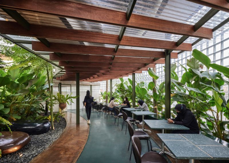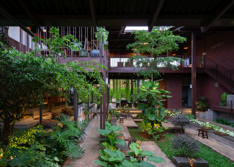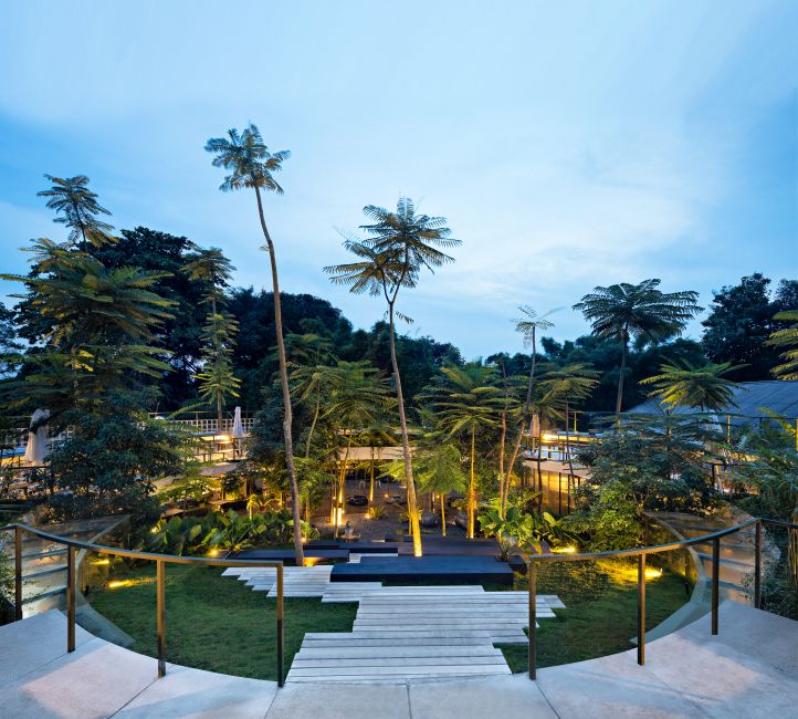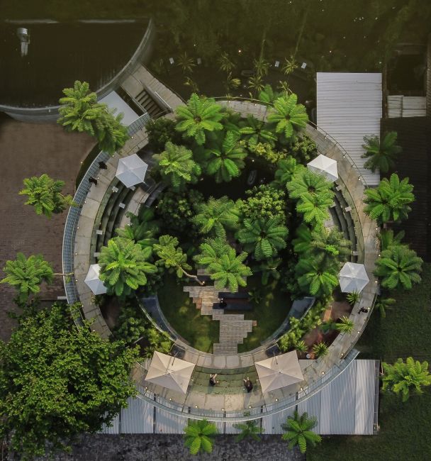 L’esperienza che viene offerta all’interno di questi spazi deve essere unica e il progetto architettonico che la caratterizza deve rivelare una storia, un racconto che si snoda attraverso scelte architettoniche scenografiche ed emozionali. Il Tanatap Ring Garden Café, a opera dello studio RAD+ar, ne è un esempio: abbraccia la natura a 360° e reinterpreta il concetto di spazio civico nella città di Giacarta in Indonesia. Il progetto nasce dall’idea di confinare e nascondere gli spazi funzionali e le sale indoor della caffetteria all’interno di un giardino, rendendo il solo involucro l’architettura stessa dell’edificio. Si definisce un prototipo unico a pianta circolare dove spiccano una serie di anfiteatri open-air che, circondati da una rigogliosa vegetazione, vengono organizzati su più livelli.