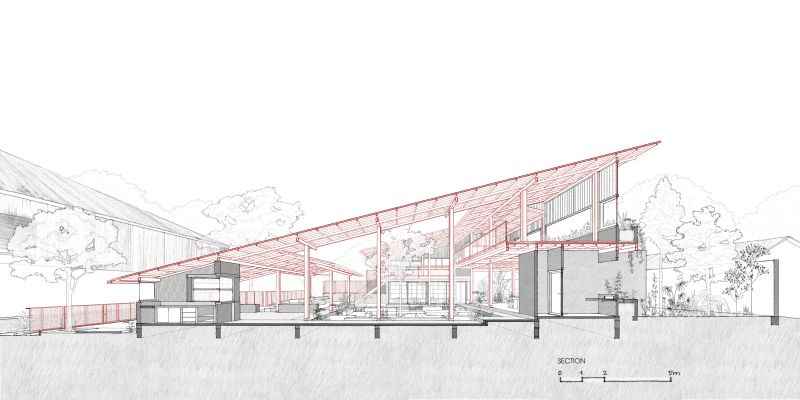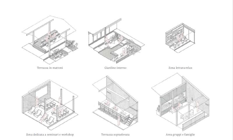 L’architettura rurale tradizionale del luogo prevede una solida abitazione principale e strutture leggere che si integrano e ospitano differenti attività quotidiane, bestiame o attrezzature agricole. Il progetto prende le mosse proprio dalla reinterpretazione di questi luoghi aperti e il risultato porta a definire uno spazio dinamico, accogliente e armonioso. Una struttura puntiforme, costituita da pilastri in carpenteria metallica, sorregge una copertura a un’unica grande falda che si interrompe nella parte centrale e comprende alcune falde minori. Sotto di essa vengono pensate differenti ambientazioni che si succedono e si distinguono per dimensione, elevazione dal suolo, altezza, riunite attorno a un fulcro centrale: la corte verde. Tali scelte permettono di accogliere diverse tipologie di ospiti contemporaneamente e soddisfarne i molteplici bisogni che spaziano dagli incontri di gruppo o di famiglia, ai seminari e workshop, fino ai momenti più tranquilli di lettura e relax, riscoprendo un rapporto più intimo con la natura circostante.