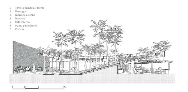 Questi risultano interconnessi tra loro mediante piattaforme dinamiche che si alzano e si abbassano e, nel loro insieme, compongono un paesaggio pensile interamente percorribile. Si tratta di un caffè dal design innovativo che raggruppa tre strategie progettuali: collegare gli alberi esistenti sul sito attraverso percorsi di circolazione interna, conferire all’ingresso un’atmosfera intima e segreta e creare un’esperienza di contrasto tra la scala architettonica, i materiali da costruzione, l’impatto del colore e della struttura, la densità della natura e la quantità di luce solare che permea l’interno degli ambienti. All’ingresso un ponte-percorso collega due alberi e rompe il confine tra esterno e interno. Entrando negli spazi, il bancone della caffetteria riveste una posizione centrale mentre tutt’attorno si sviluppano tavoli e sedute. Il muro retrostante al bancone funge da elemento di confine tra l’area indoor e il giardino esterno; a partire dall’area centrale, infatti, gli spazi diventano gradualmente meno intimi e vengono illuminati dalla luce naturale sempre più penetrante. Da un lato viene ricavata una sala più intima e riservata, dedicata a gruppi o famiglie che desiderano ritrovare l’idea di casa all’interno di uno spazio pubblico, mentre dall’altro una porta nascosta conduce a tavoli e sedute a cielo aperto. Un taglio nel solaio, posto in corrispondenza della zona bar, incuriosisce i visitatori e li stimola a esplorare la vita che si svolge nel giardino esterno, proprio sopra di loro. Questo è stato pensato come esperienza conclusiva che offre il piacere sensoriale e l’opportunità di rilassarsi e riscoprire il piacere di assaporare una tazza di caffè nei diversi momenti della giornata, circondati da una ricca vegetazione tropicale. Da qui è possibile anche godere dello skyline della città.