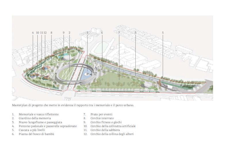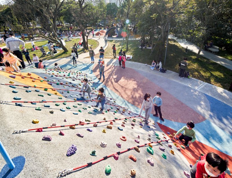 Il progetto valorizza la topografia esistente e gli alberi secolari, introducendo bacini di irrigazione e leggere altimetrie che svolgono funzioni ecologiche e ludiche. Il Yi-Wei Ring è integrato nel paesaggio e accompagna le attività del parco: lungo il tracciato si aprono spazi di sosta, contemplazione e gioco. Sedute in cemento, aree attrezzate, scivoli integrati nel terreno e pareti da arrampicata trasformano il memoriale in un luogo vivo e partecipato. La promenade sospesa non è solo infrastruttura, ma architettura relazionale, che restituisce dignità al passato, connette territori divisi e trasforma un’area marginale in landmark urbano e comunitario.