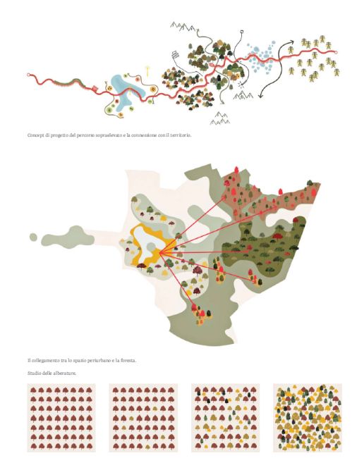 Il Red Path è una infrastruttura leggera e modulare, sollevata su piloni per minimizzare l’impatto al suolo e lasciare indisturbata la natura sottostante. La passerella è progettata per adattarsi al terreno, evitando l’abbattimento degli alberi; dove necessario sono stati piantati nuovi arbusti autoctoni, arricchendo il paesaggio e contribuendo ad aumentare la biodiversità. Il sistema modulare della struttura è stato pensato in modo parametrico per garantire accessibilità universale grazie a una pendenza minima, permettendo così anche alle persone con mobilità ridotta di accedere alla foresta e alle pendici montane.