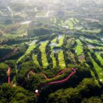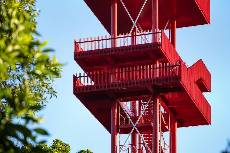 La torre terminale segna la conclusione del percorso e offre un punto di osservazione privilegiato. A livello del suolo, nell’area di Bihu, il Red Path accompagna i visitatori verso il Lake of Champions, un’area dedicata allo sport e alla botanica, dove trovano spazio cinque campi sportivi, un vivaio, un centro di ricerca e sviluppo botanico-sportivo. Il percorso termina nel parco forestale urbano, offrendo un’immersione completa nella natura.