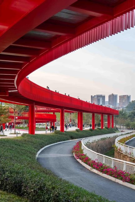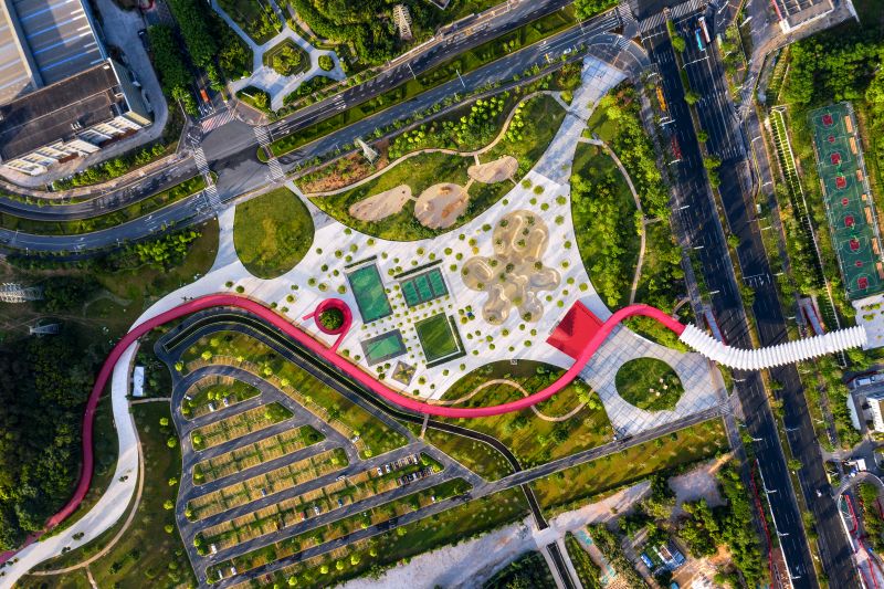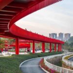Nel distretto di Guangming, a Shenzhen – una delle città più dinamiche della Cina – si trova l’Hongqiao Park, progettato da LOLA Landscape Architects in collaborazione con TALLER Architects e Land and Civilization Compositions. Il parco si estende su oltre 600 ettari e si caratterizza per la presenza del Red Path, una promenade sopraelevata lunga circa 4 km che attraversa aree forestali, laghi artificiali, strutture sportive e spazi urbani. Questo elemento lineare e continuo collega il paesaggio alla città, alla foresta e alle montagne.