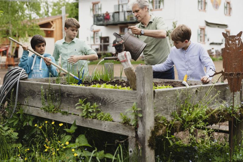Le camere da letto sono dotate di letti regolabili e le finestre sono posizionate in modo che anche chi usa una sedia a rotelle possa godere della vista sul giardino. In due appartamenti, il divano letto presente nella zona cucina- soggiorno integra un letto ortopedico completamente attrezzato. Infine le aree comuni della zona benessere e della sauna sono completamente accessibili, e per consentire allenamenti anche a chi ha mobilità ridotta sono stati scelti attrezzi innovativi come il WaterGrinder. Inoltre, Haus Himmelfahrt promuove attivamente l’inclusività collaborando con progetti sociali e sostenendo iniziative che coinvolgono persone con disabilità. I suoi arredi, per esempio, provengono da progetti che impiegano persone con difficoltà, contribuendo così a una forma di benessere che va oltre il semplice relax fisico, ma che abbraccia anche il benessere sociale. Nella struttura vengono utilizzati bicchieri fatti a mano da vecchie bottiglie di vino e materassi biologici realizzati da un progetto sociale locale.