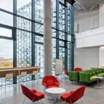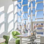 Ventilazione, illuminazione naturale e ombreggiamento forniti dalla facciata sono integrati all’interno da sistemi idronici di riscaldamento e raffreddamento distribuiti attraverso pannelli radianti a soffitto.