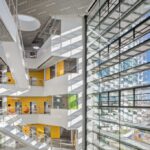 Tutti i livelli, compresi i due interrati, sono collegati verticalmente da un ampio e arioso atrio a tutta altezza rivolto a sud verso lo spazio verde esterno, che fornisce luce naturale a tutti i piani e funge da cuore connettivo del complesso. Un ingresso situato in posizione centrale fornisce l’accesso diretto dalla strada pubblica all’area verde, offrendo allo stesso tempo viste sugli spazi didattici e creativi distribuiti all’interno.