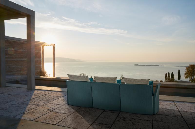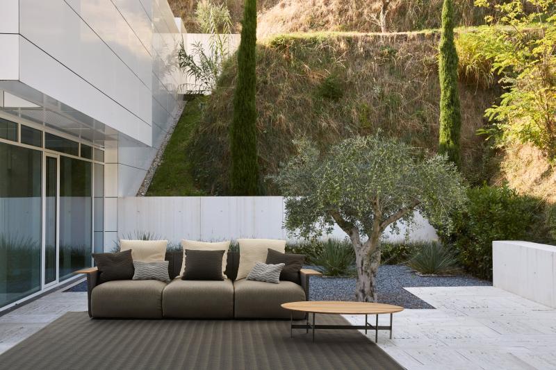 Il divano è disponibile con la cuscineria in tono con le sedute o con i cuscini della linea Wave, caratterizzata da una trama ondilinea.