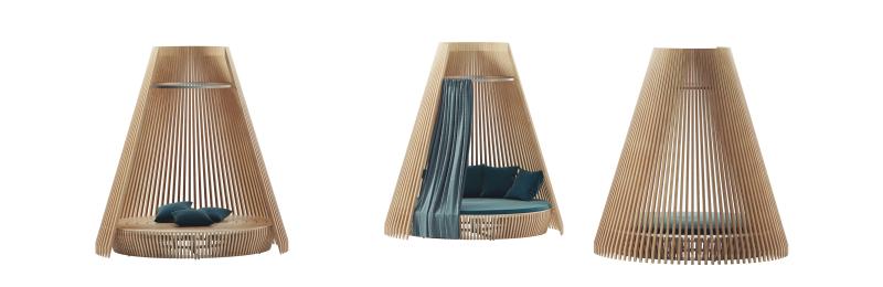 Hut, spostabile e adattabile senza vincoli a terra, è disponibile con altezza di 320 cm e diametro di 300 cm e può essere personalizzato con un’elegante tenda che consente di chiudere il nido, assicurando un costante e piacevole passaggio dell’aria e proteggendo dalla luce diretta del sole.