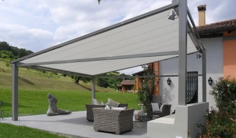 myShell Perla è una pergola di nuova concezione, che utilizza al meglio i vantaggi di myShell T/30 (una tenda cassonata con guide laterali e con telo costantemente in trazione), ampliandone le possibilità di utilizzo, mediante l’aggiunta di montanti e traversi. Si ottiene così una pergola assolutamente unica, modulabile secondo le diverse esigenze. myShell Perla potrà essere addossata direttamente alla parete o, in assenza di questa, ancorata a pavimento trasformandosi, con l’aggiunta di montanti posteriori e traversi laterali, in una struttura autoportante. Ogni modulo myShell Perla può avere una larghezza massima di 5 m. e una diagonale massima di 6 m.