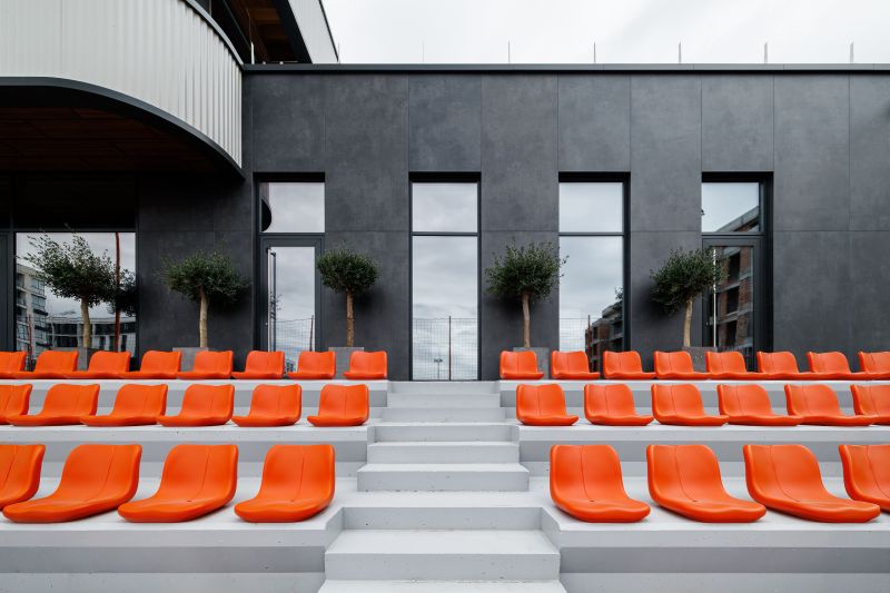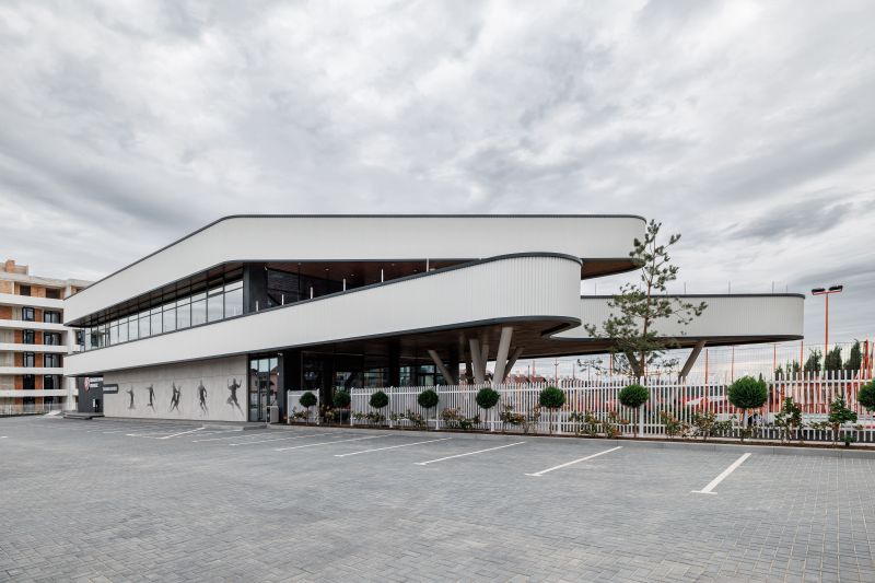 Lo studio LH47 ARCH ha progettato il primo centro sportivo alimentato a energia solare della Moldavia. Situato a Durlești, città del Municipio di Chișinău, l’edificio si sviluppa su un terreno in pendenza con un dislivello di 5 metri, rivelando gradualmente la sua profondità spaziale: appare come un volume a due piani dall’ingresso e si apre su tre livelli visibili dal lato del campo. Questa configurazione permette alla struttura di integrarsi armoniosamente con l’ambiente circostante e di sfruttare la topografia naturale per stabilità e drenaggio. Il tetto integra pannelli solari che soddisfano parte del fabbisogno energetico dell’edificio.