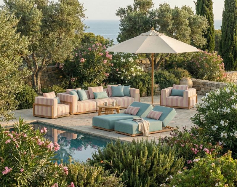 Raytent Living Azalea e Irisun Rigati: proposte dal forte impatto visivo, dove il design geometrico incontra la resistenza della fibra acrilica tinta in massa.