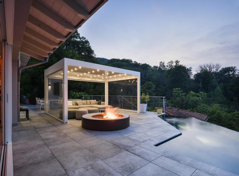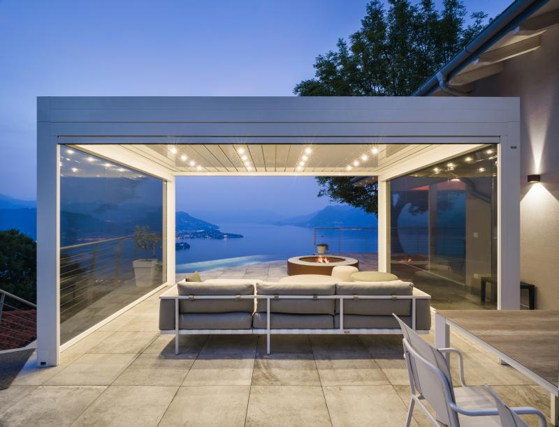 Inoltre, le chiusure laterali offrono il giusto riparo dalla brezza che, specialmente la sera, scende dalle colline circostanti e può talvolta disturbare i momenti di relax. Le chiusure laterali sono state applicate su tre dei quattro lati, così il lato panoramico è sempre libero per godere della vista.