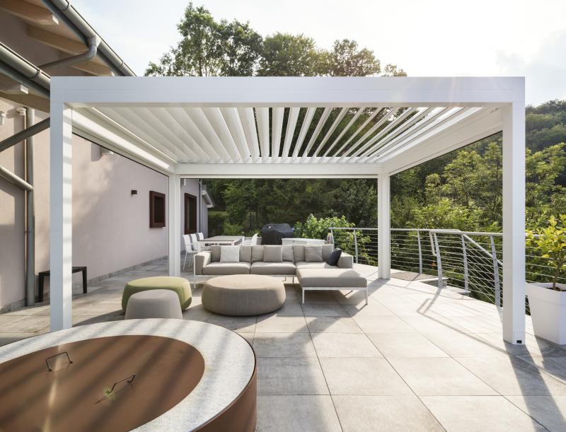 Da qui l’idea di installare una pergola bioclimatica, nello specifico il nuovissimo modello Med Joy di Gibus: capace di offrire garanzie sia per quanto riguarda la protezione dalla pioggia che dal vento. Infatti, grazie alle lamelle orientabili di copertura, non è più necessario preoccuparsi di rimuovere i divani ogni volta che si presenta un po’ di pioggia, potendo così avere una zona esterna arredata e sempre pronta a essere vissuta.