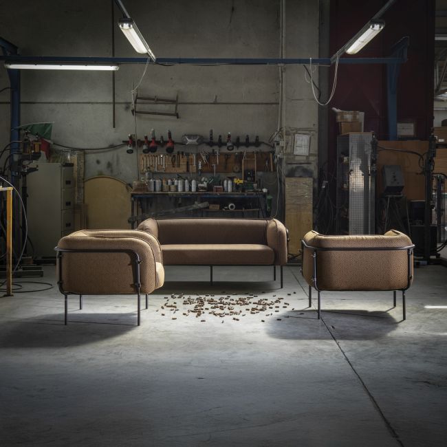 Meltemi di Patrick Norguet, che è composto da divani, sedute e tavoli, si basa sulla modularità e sulla intercambiabilità dei materiali. Le strutture sono in alluminio, gli intrecci in corda, i tessuti di Limonta. In tutto ciò il piano del tavolo è in metallo smaltato, lo stesso che troviamo nelle pentole, a garantire alla superficie una maggiore resistenza nel tempo.