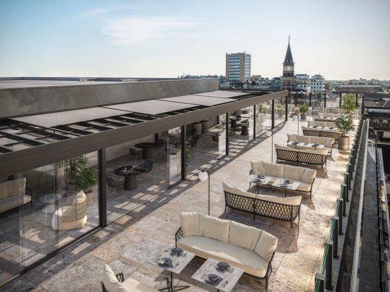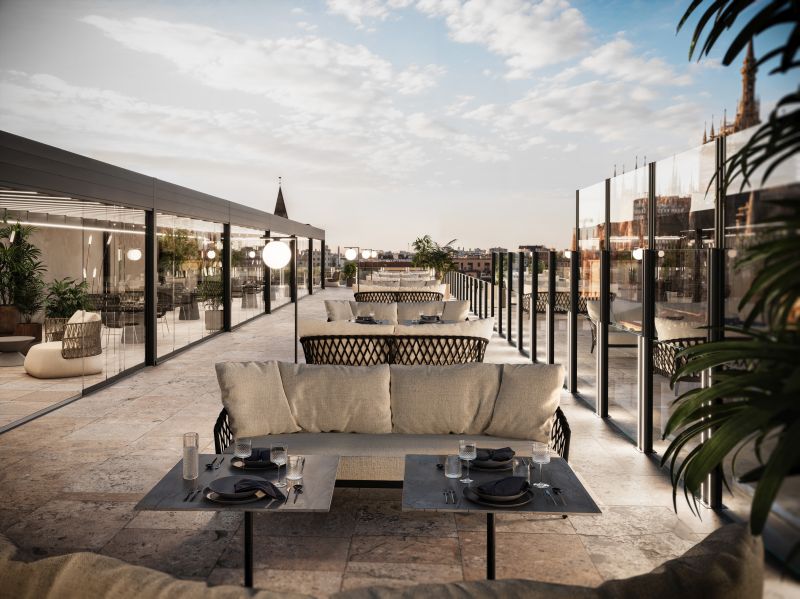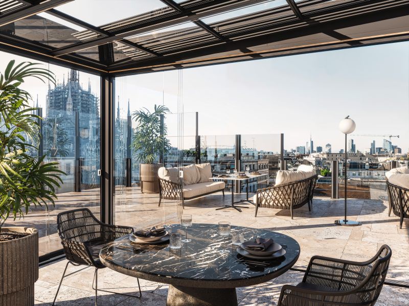 Al Salone del Mobile.Milano 2026, Protezioni porta in scena le schermature in vetro progettate per resistere a qualsiasi meteo. Durante la design week, il cielo di Milano – imprevedibile e spettacolare – diventa protagonista di soluzioni che offrono protezione totale, senza mai rinunciare a luce naturale e contatto con il paesaggio. Al FuoriSalone firma il dehors per Swiss Corner.