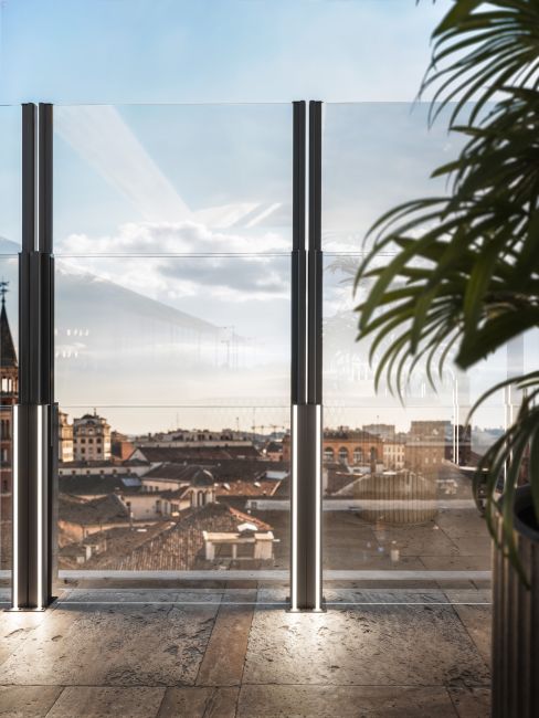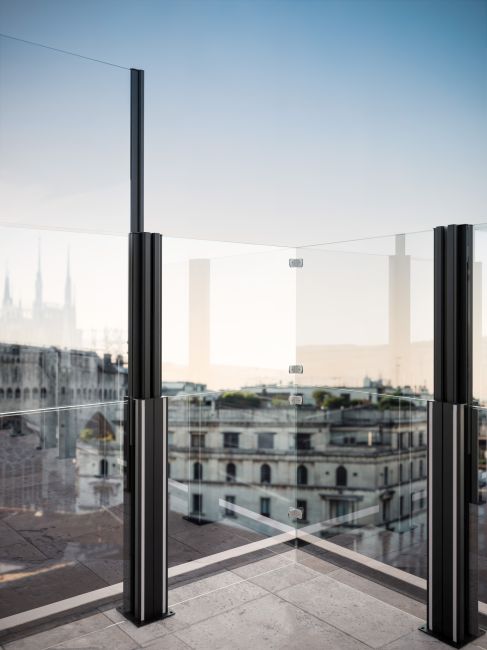 Pareo Up Balaustra, il parapetto senza corrimano con sistema pneumatico brevettato, protegge lo spazio esterno da intemperie e rumore. La struttura, certificata per la sua sicurezza, è costituita da due o tre pannelli in vetro temperato e vetro stratificato, che raggiungono fino a 2,7 metri di altezza grazie a un sistema telescopico. È prevista inoltre la presenza di un modulo fisso con vetro di sicurezza, che le permette di assumere la fondamentale funzione di parapetto, in contesti di installazione con altezza superiore al metro.