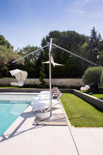 In questa area sono stati inseriti anche due ombreggiatori motorizzati Kolibrie da 3.2m, in tessuto Dacron: l’eleganza e le finiture nautiche di questa vela, che costituisce un vero e proprio complemento d’arredo di grande effetto, hanno risposto alle esigenze del committente. I due ombreggiatori sono stati posizionati nella zona delle sedie sdraio a bordo piscina.