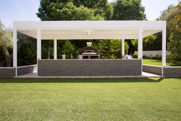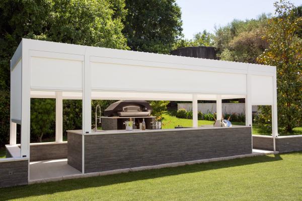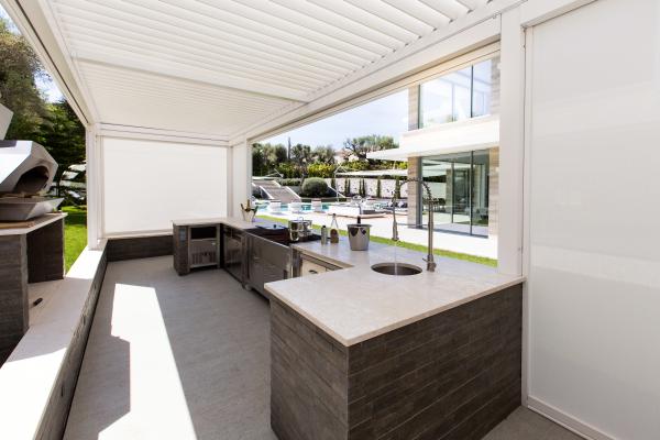 Il terzo prodotto scelto è una pergola bioclimatica, Kedry Plus (8 x 2,9 m), ideale per creare una zona dedicata alla cucina esterna, che doveva essere separata dalla zona piscina e protetta per creare una zona di cottura funzionale. Le tende verticali Vertika con telo Soltis 92, con maestria IO e Wind Block System, assicurano un’ulteriore protezione alle attrezzature da cucina durante i mesi invernali. Durante le ore del tramonto, le tende Vertika filtrano i raggi del sole per garantire una totale protezione a chi sta cucinando, eliminando eventuali fastidiosi riflessi.