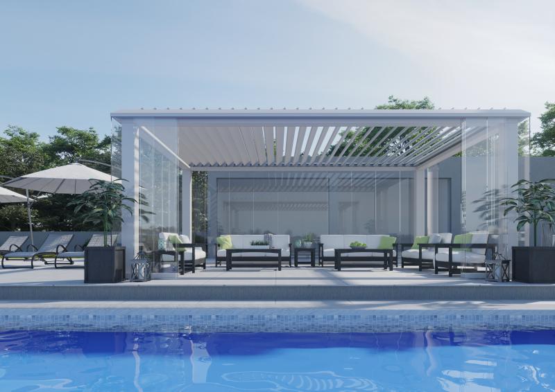 Il sistema tuttovetro posizionato esternamente alla struttura consente di aprire e chiudere i lati a seconda delle condizioni atmosferiche con un semplice gesto. La copertura della pergola è costituita dalle caratteristiche lamelle in alluminio orientabili da 0° a 140°. La loro inclinazione, attivata comodamente tramite l’uso di un telecomando, permette di ruotare gli elementi con la doppia funzione di protezione dai raggi solari e climatizzazione dell’ambiente: in base all’orientamento delle lamelle, la struttura, offre protezione totale o parziale dal sole, una perfetta climatizzazione e un sicuro riparo dalla pioggia.