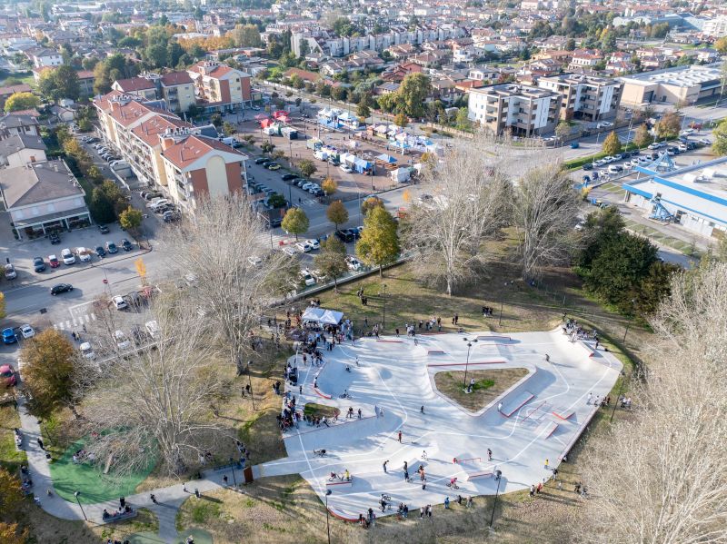 Il progetto di Abad Architetti – che rientra nel Piano Urbano Integrato della Città metropolitana di Venezia PNRR “Più Sprint” – ha previsto il raccordo tra la nuova area dedicata allo skateboarding, le sistemazioni a verde e i percorsi pedonali. Collegato al palazzetto dello sport, è accessibile sia dal parcheggio esistente su via dello Sport che dai percorsi verdi interni pedonali. Le preesistenze non sono state eliminate, bensì integrate nel progetto: i giochi per bambini sono stati sostituiti con attrezzature più sicure e collocate in uno spazio specificamente progettato, a distanza di sicurezza dalla pista e dotato di panchine.