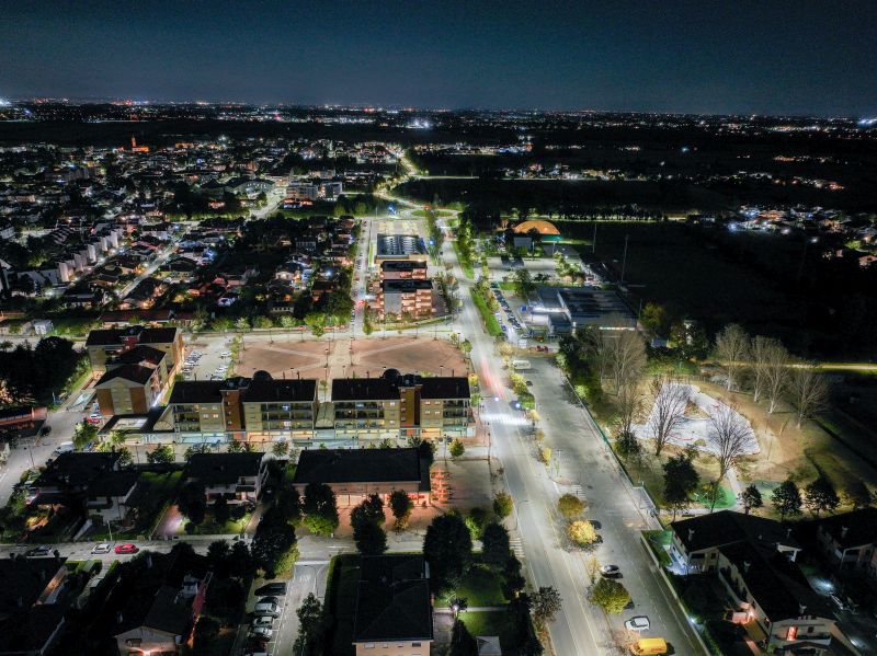 Attorno all’area sportiva il verde è organizzato come parco pubblico con percorsi, alberature e zone d’ombra; la vegetazione esistente è stata mantenuta e integrata con nuove piantumazioni di specie autoctone: quattro Acer campestre e quattro Quercus robur. Gli aceri, dalla chioma più contenuta, sono collocati nelle aree più vicine alla pista, mentre le querce si trovano dove è possibile consentire lo sviluppo completo della chioma senza rischi o necessità di potature di contenimento. Siepi arbustive e nuove alberature contribuiscono sia alla qualificazione paesaggistica sia al miglioramento del comfort nei mesi più caldi, garantendo ombreggiamenti parziali e continuità verde.