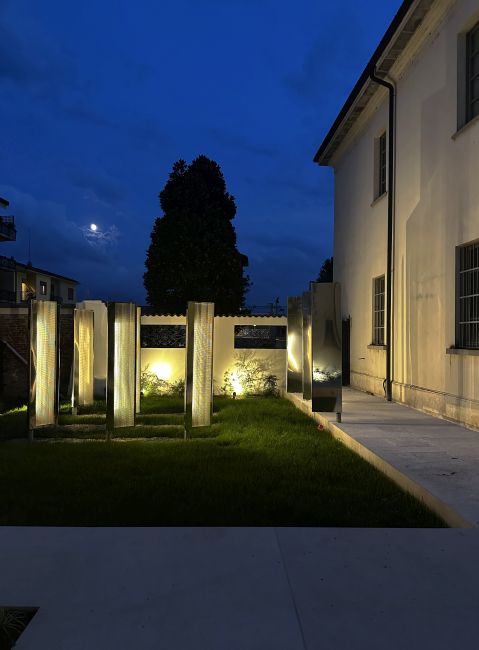 Nella promenade architecturale si trovano elementi site specific: totem con una facciata specchiante e l’altra in lamiera traforata, capaci di ruotare liberamente con il vento. Collocati sul prato o lungo i percorsi, assumono diverse funzioni – oggetti ludici, supporti espositivi, corpi illuminanti o semplici marcatori visivi – e diventano strumenti che orientano lo sguardo, invitano alla scoperta e valorizzano i dettagli architettonici del contesto.