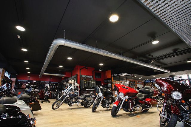 Per l’illuminazione del nuovo showroom Harley Davidson di Legano è stata scelta Rossini Illuminazione. Il progetto architettonico dell’architetto Stefano Cellerino dello studio Modus di Milano, dopo un accurato studio relativo agli spazi e alle esigenze estetiche e illuminotecniche, si è focalizzato su INDO nella versione a soffitto. INDO, apparecchio LED 4000K con potenza di 120 Watt, ha la struttura in pressofusione di alluminio e il diffusore in policarbonato e garantisce una altissima resa luminosa, ideale quando si tratta di illuminare ampie superfici e con importanti altezze.