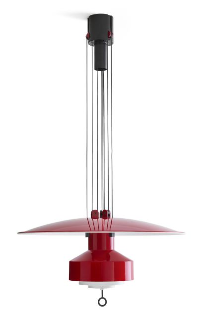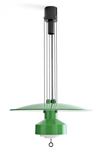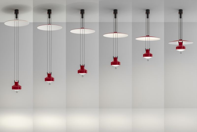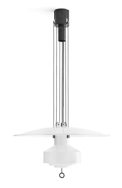 L’idea fu sviluppata e raffinata tra il 1957 e il 1958: una lampada mobile (sali-scendi appunto) capace di modificare l’intensità luminosa spostandosi attraverso un sistema di carrucole. Un sistema che permettesse di muovere una fonte luminosa verso il basso e verso l’alto, regolando così l’intensità della luce sia sul piano del tavolo, sia nell’ambiente circostante. Contemporaneamente, il medesimo sistema consente di avvicinare o allontanare un disco riflettente posizionato sopra la fonte. Disco e corpo lampada scorrono in senso opposto lungo i cavi, avvicinandosi o allontanandosi. La distanza tra i due elementi cambia con un semplice gesto, una mano che spinge o tira un piccolo occhiello posto all’estremità inferiore del corpo lampada. Quando la fonte luminosa viene avvicinata al tavolo, la luce diretta si concentra sul piano sottostante; la luce indiretta illumina il soffitto mentre il disco, distante, non crea ostacoli. Quando la fonte luminosa si alza, allontanandosi dal tavolo, ecco che interviene il disco, ora molto più vicino, che riflette l’emissione indiretta e aumenta la quantità di luce diffusa nell’ambiente. Un concept semplicemente straordinario ancora oggi.
