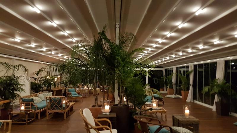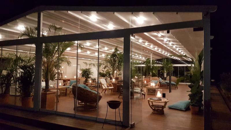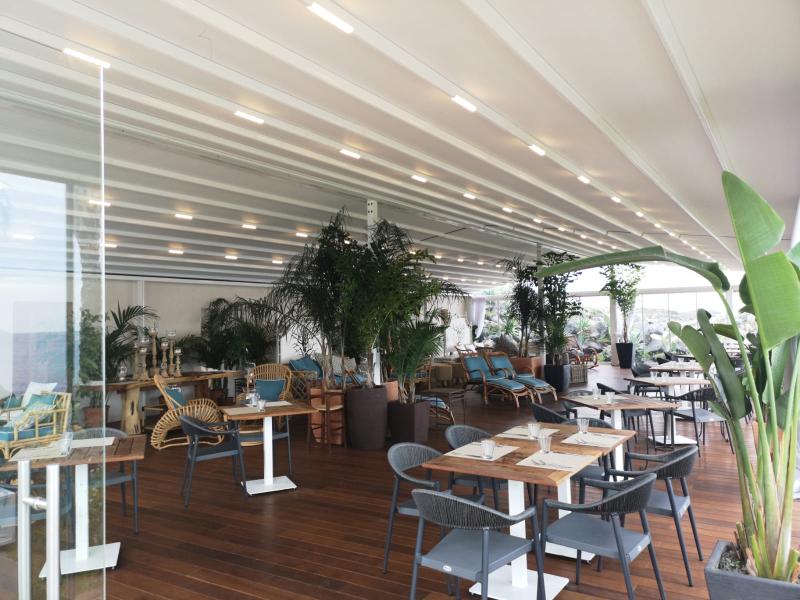 Nell’ambito di questo progetto è stata installata, la Pergola 1200 di La Tendamania, nella versione doppia inclinata in alluminio con tetto impacchettabile e vetrate scorrevoli modello “Skyline” a tre e cinque guide.