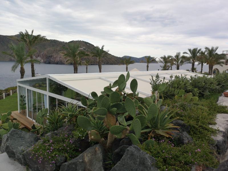 Il Therasia Resort Sea & Spa sull’isola di Vulcano, dal quale si possono ammirare tutte le Isole Eolie, è uno scenario di grande bellezza che ha ispirato all’architetto Giorgio Di Scala un interessante progetto di gestione multifunzionale dello spazio esterno.