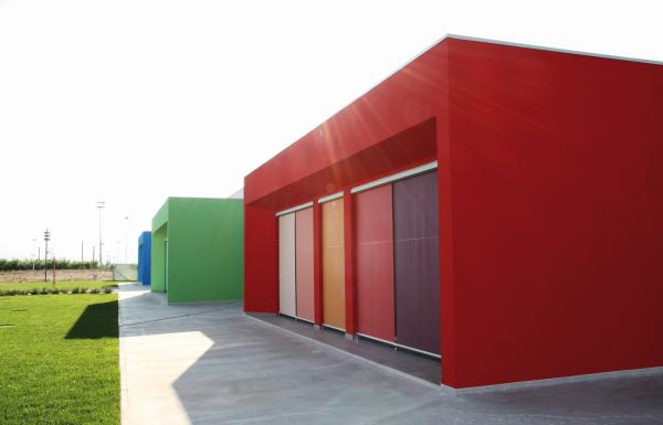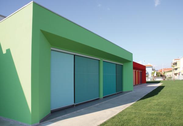 Resstende ne firma la schermatura solare che ben si contestualizza in un’ambientazione interamente dedicata all’infanzia. In questo progetto la tecnicità del prodotto si fonde perfettamente con le linee regolari e rigorose dei tre blocchi che costituiscono la struttura.