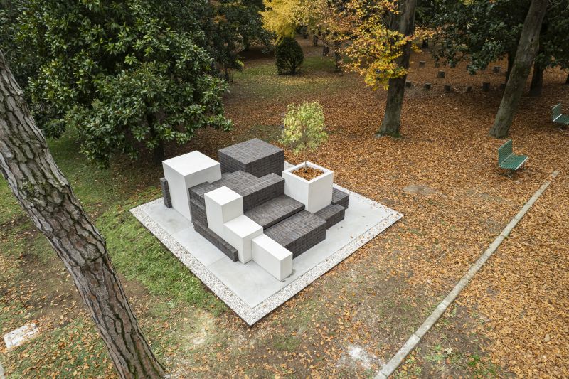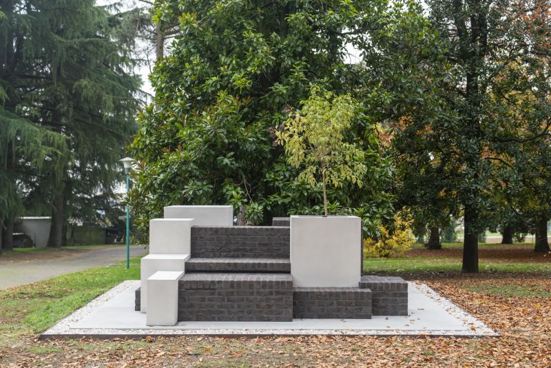Situata nel giardino degli Istituti Filippin  a Treviso, “Decostruzione” è una struttura di 9 metri quadrati, smontabile e riciclabile, concepita come una scultura che interpreta il tema del movimento in rapporto allo stare, alla sosta, decostruendo ed interpretando appunto il concetto di scala, intesa come metafora architettonica del pensiero e del movimento. Il progetto è stato sviluppato anche grazie all’uso di DALL·E, un software di intelligenza artificiale utilizzato per generare visualizzazioni iterative, esplorare varianti spaziali e tradurre l’intuizione progettuale in un insieme coerente di forme. L’IA ha permesso agli studenti di riflettere più a fondo sull’interconnessione tra movimento, percezione, volumetrie e possibilità d’uso. Il risultato è un ambiente multiforme, un luogo sospeso tra contemplazione, comunicazione e interazione: un padiglione che invita a fermarsi, a salire, a osservare, a interrogarsi.
