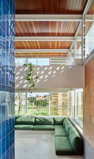 Anche i tre volumi che contengono i vari locali hanno ognuno una destinazione specifica: in quello principale si trovano la cucina, il soggiorno, il bagno e la camera padronale; in un altro si trovano ulteriori camere e la lavanderia mentre l’ultimo ospita la dépendance per gli ospiti e un ambiente a uso laboratorio. Per collegare i differenti spazi sono stati predisposti percorsi continui, passerelle e ampie finestre che contribuiscono anche ad annullare i confini tra interno ed esterno, invogliando i residenti a seguire i ritmi lenti della natura.