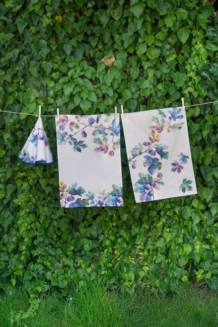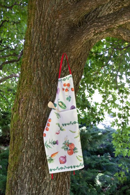 Tovaglie, runner, tovaglioli, set americani, presine, grembiuli e guanti da forno sono disponibili nei colori Bianco, Oltremare, Lattuga, Sole, Tortora, Lampone e Matita. Tovaglie e set americani sono caratterizzati da un pratico trattamento antimacchia efficace contro lo sporco che rende le proposte adatte a tutti gli ambienti – indoor e outdoor. Infine, vengono introdotte due importanti novità: il grembiule con pettorina regolabile in tutti i nuovi disegni stampati e il ritorno della girella in monospugna (disponibile in Orto e Fichi).