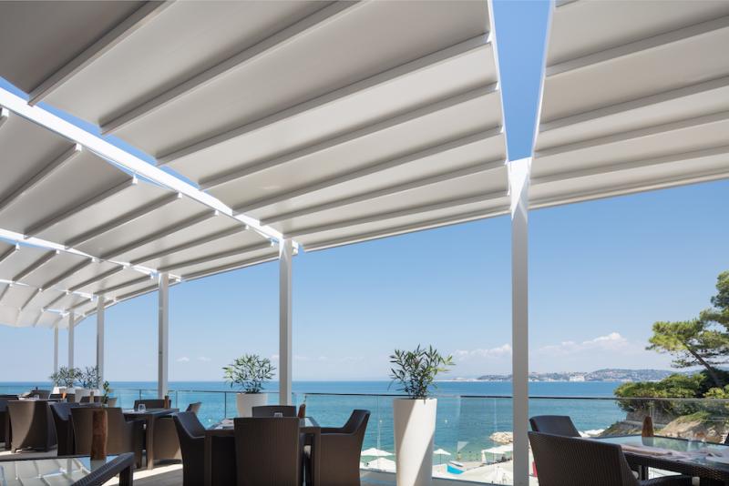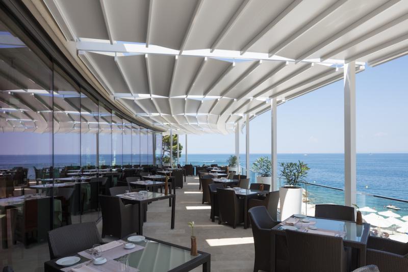 Quando chiusa, la copertura impermeabile permette di ombreggiare uniformemente i 113 mq sui quali si estende il terrazzo, regalando all’hotel un’inedita e apprezzata area adibita ai pranzi e alle colazioni. Alla sera invece, con un semplice gesto, la copertura arretra silenziosamente fino a occupare un ingombro minimo, aprendo così una finestra sul cielo stellato dell’Istria.
