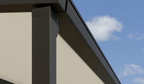 Acciaio inox per la struttura di Velenda, elegante ed essenziale, e laminato velico con cuciture radiali grazie alle quali si ottiene un perfetto tensionamento del telo delle vele ombreggianti e si evita la formazione di sacche d’acqua in caso di pioggia.